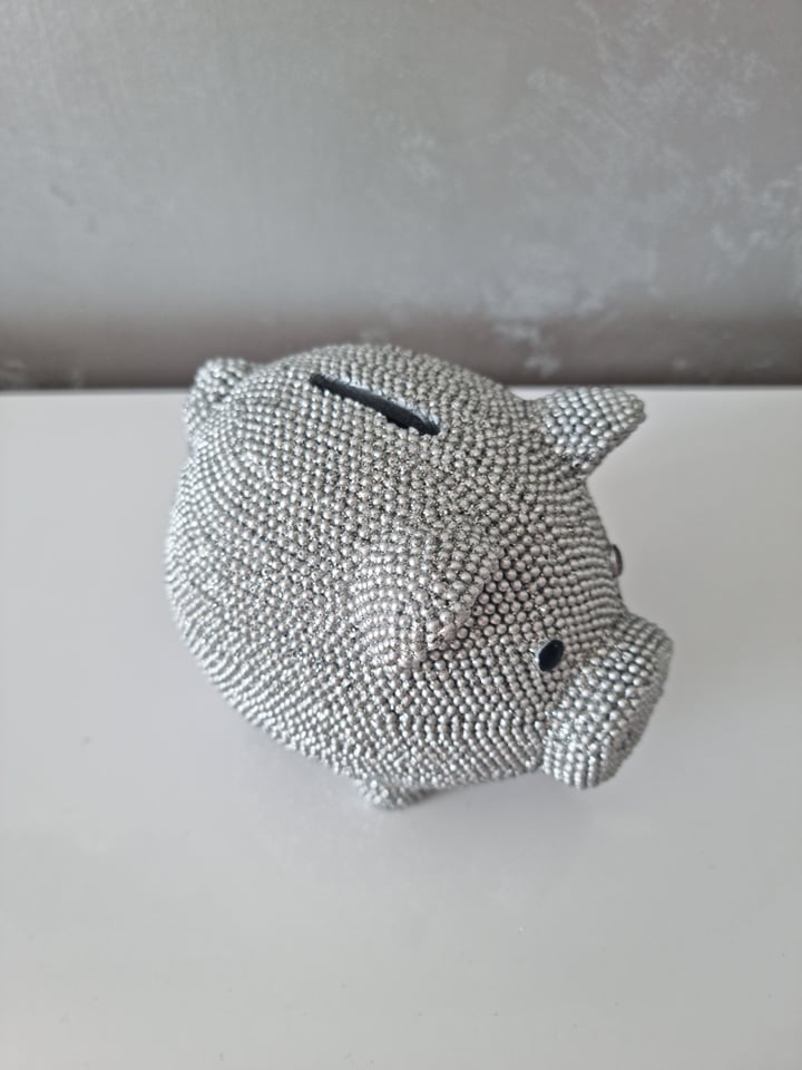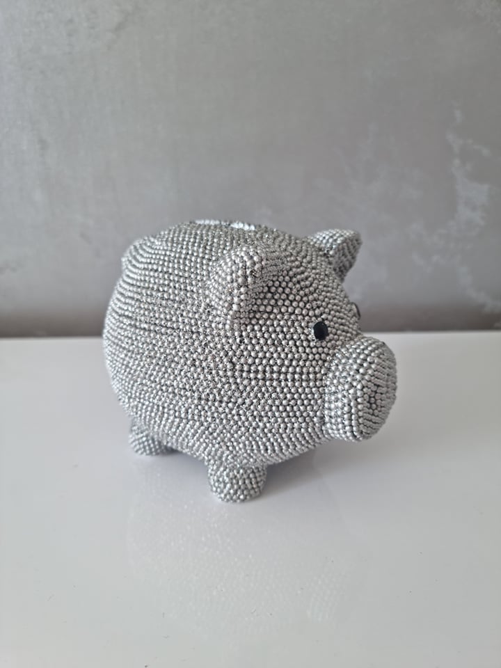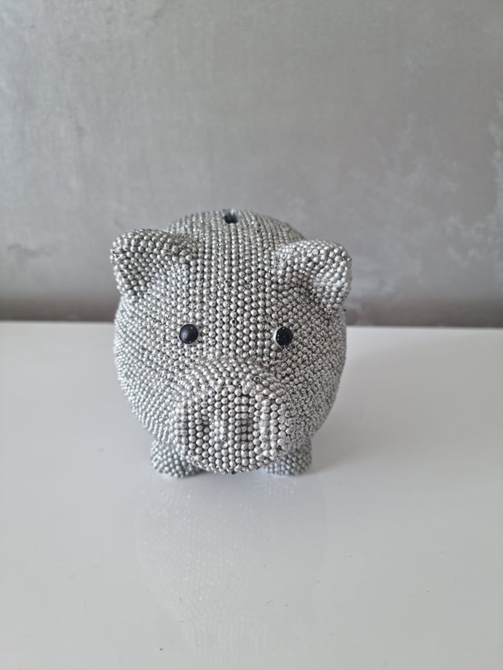 Štýlová pokladnička prasiatka v striebornej farbe.