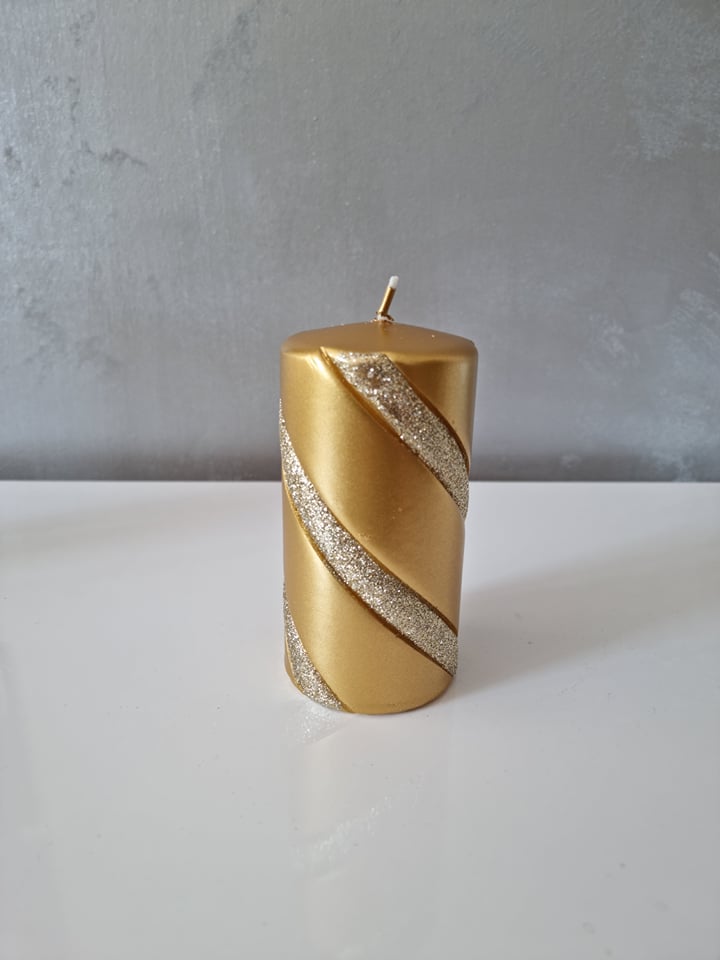 Dekoratívna sviečka zlatej farby so zdobením.