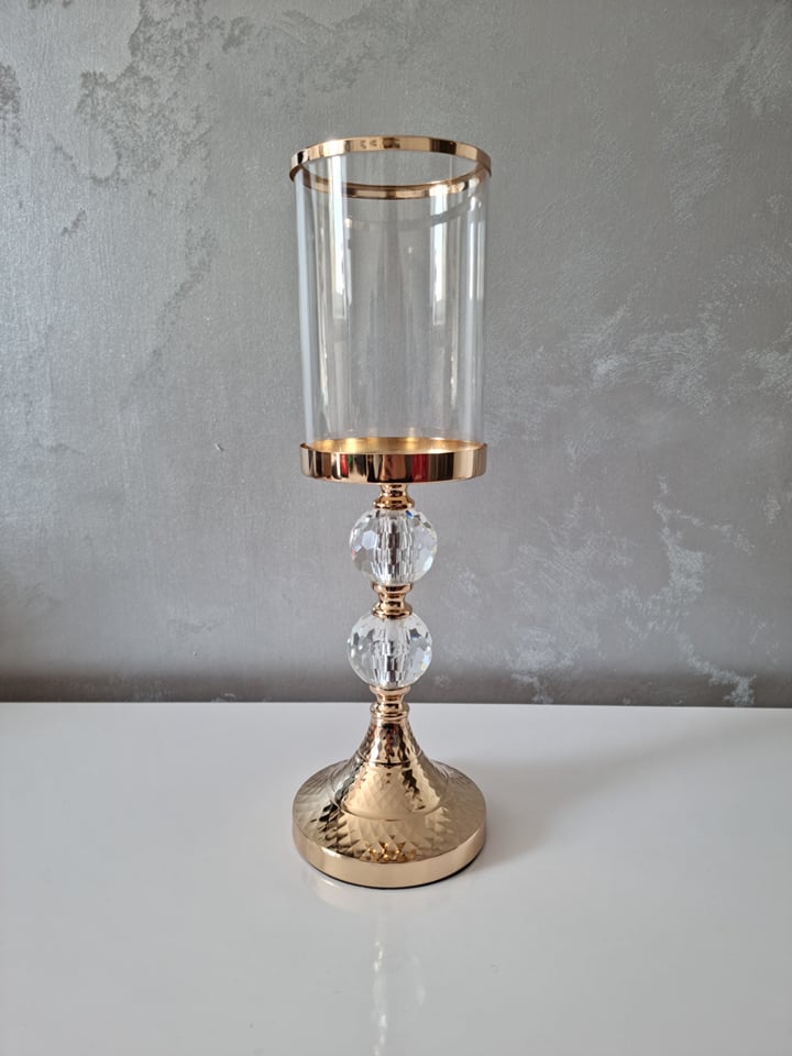 Elegantný svietnik vo farbe francúzskeho zlata s dvomi krištálovými guľami.