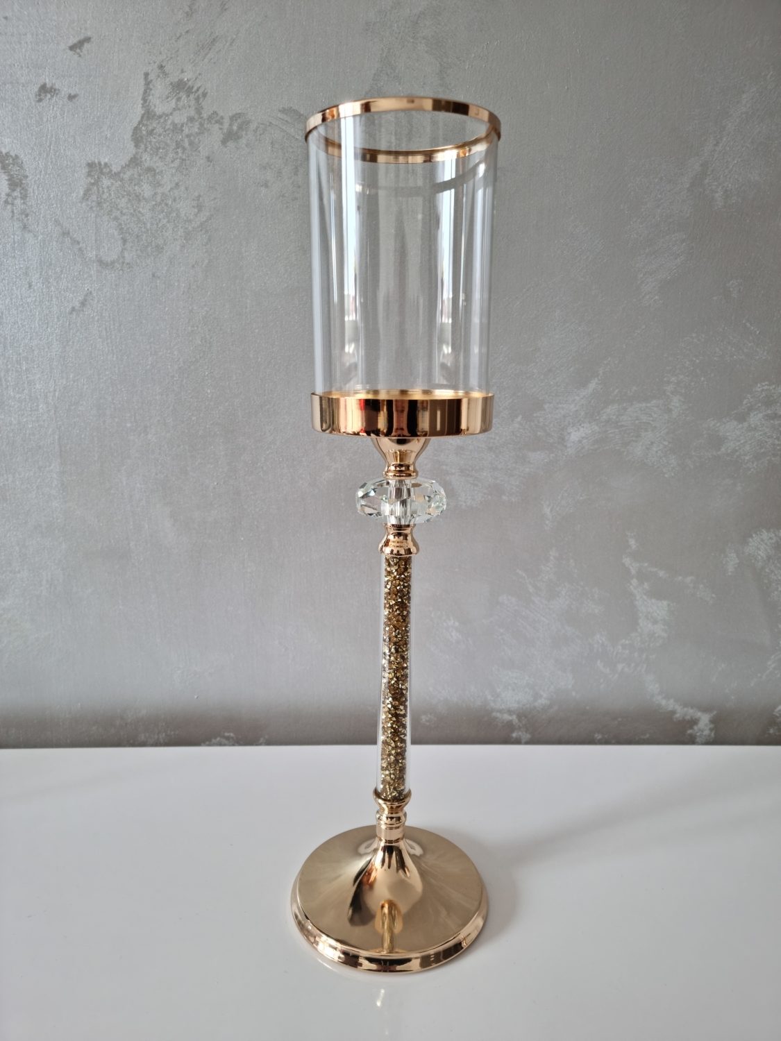Trendy svietnik vo farbe francúzskeho zlata doladení trblietajúcimi kamienkami v strednej veľkosti.